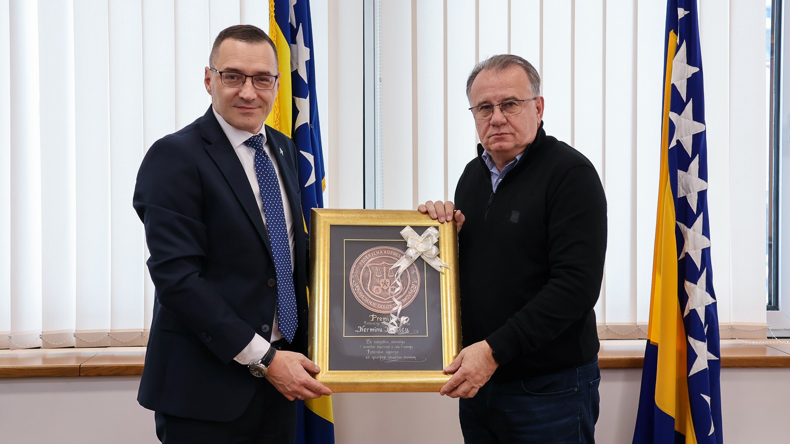 Direktor Federalne agencije za upravljanje oduzetom imovinom Emir Bašić uručio je danas, u sjedištu Vlade Federacije BiH u Sarajevu, zahvalnicu premijeru Federacije Bosne i Hercegovine Nerminu...